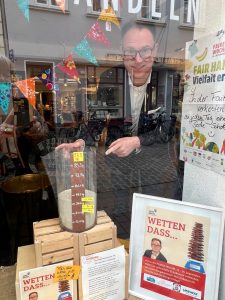 Das Gesamtergebnis der im Rahmen der Fairen Woche verkauften Schokoladen wird am Montag, 29. September verkündet. Wer neugierig ist, kann im Schaufenster des Weltladens auch den tagesaktuellen Pegelstand sehen. Dort ist auch die bunte Vielfalt fair gehandelter Schokoladen ausgestellt, die es schwer macht, mit nur einer Tafel Schokolade den Laden zu verlassen.